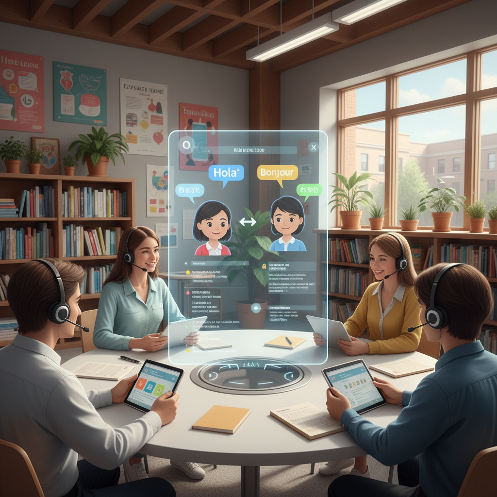 Studenci uczący się języka poprzez interakcje z postaciami AI.